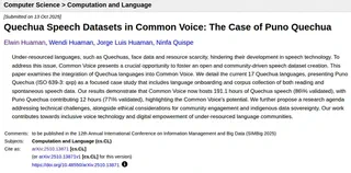 Under-resourced languages, such as Quechuas, face data and resource scarcity, hindering their development in speech technology. To address this issue, Common Voice presents a crucial opportunity to foster an open and community-driven speech dataset creation. This paper examines the integration of Quechua languages into Common Voice. We detail the current 17 Quechua languages, presenting Puno Quechua (ISO 639-3: qxp) as a focused case study that includes language onboarding and corpus collection of both reading and spontaneous speech data. Our results demonstrate that Common Voice now hosts 191.1 hours of Quechua speech (86% validated), with Puno Quechua contributing 12 hours (77% validated), highlighting the Common Voice’s potential. We further propose a research agenda addressing technical challenges, alongside ethical considerations for community engagement and indigenous data sovereignty. Our work contributes towards inclusive voice technology and digital empowerment of under-resourced language communities.